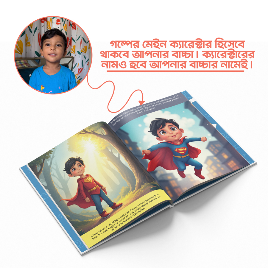 বিঃদ্রঃ আমাদের Customized Story Book-এ ব্যবহৃত শিশুর ছবিগুলো রিয়েল ছবির উপর ভিত্তি করে তৈরি করা হয়। তবে এগুলোকে কার্টুনিস্ট/ইলাস্ট্রেটেড ভার্সন-এ রূপান্তর করা হয়। তাই চূড়ান্ত ছবির আউটপুট সাধারণত ৮০–৯০% মিল থাকবে আসল ছবির সাথে, এবং এতে কিছুটা আর্টিস্টিক পার্থক্য থাকতে পারে।